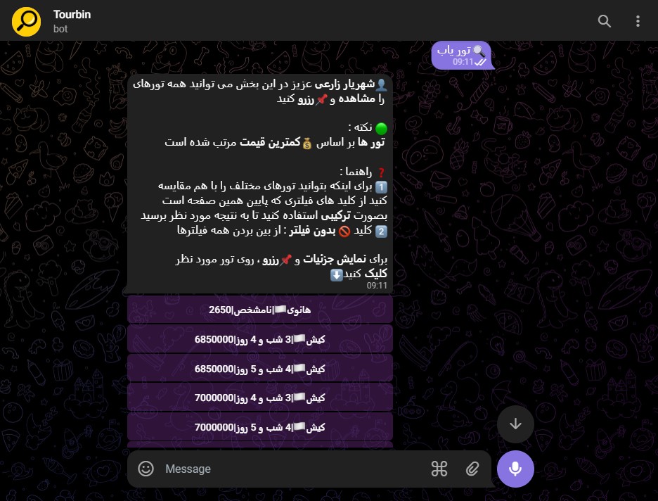 یکی از قابلیت های اصلی این ربات امکان مشاهده سریع تور های موجود است. اگر قصد سفر دارید و می خواهید اطلاعاتی درباره مقصد، تاریخ، قیمت و امکانات تور ها به دست آورید، کافی است وارد ربات شوید و چند مرحله ساده را دنبال کنید: